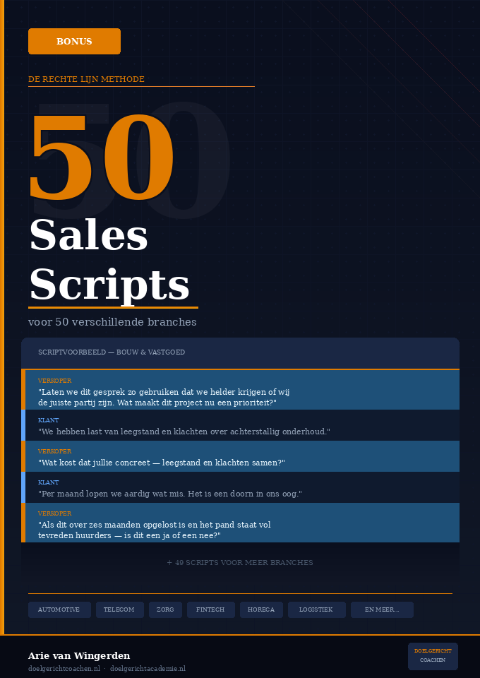 Elk script is opgebouwd in dialogvorm (donkerblauw = verkoper, oranje = klant) en volgt de vijf stappen van de Rechte Lijn: kader, verbinding, verheldering, richting en afronding.